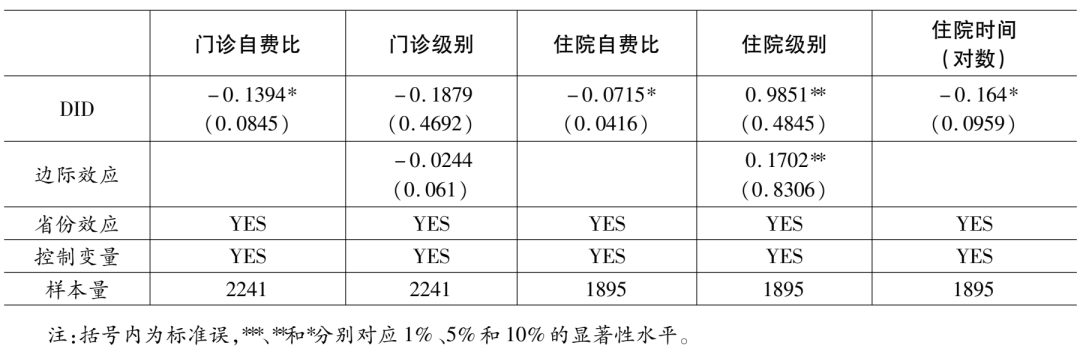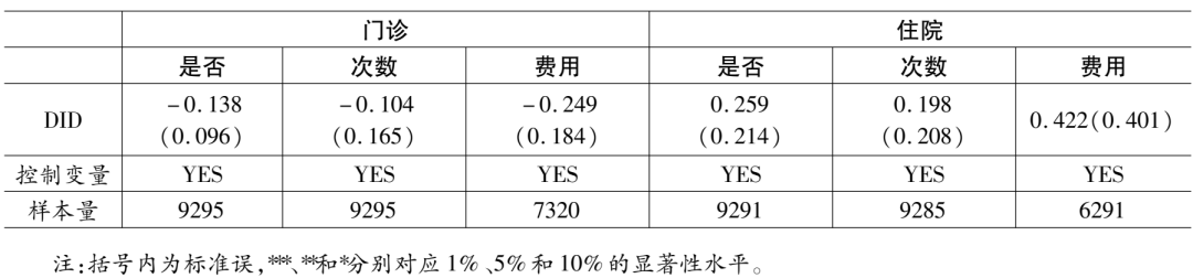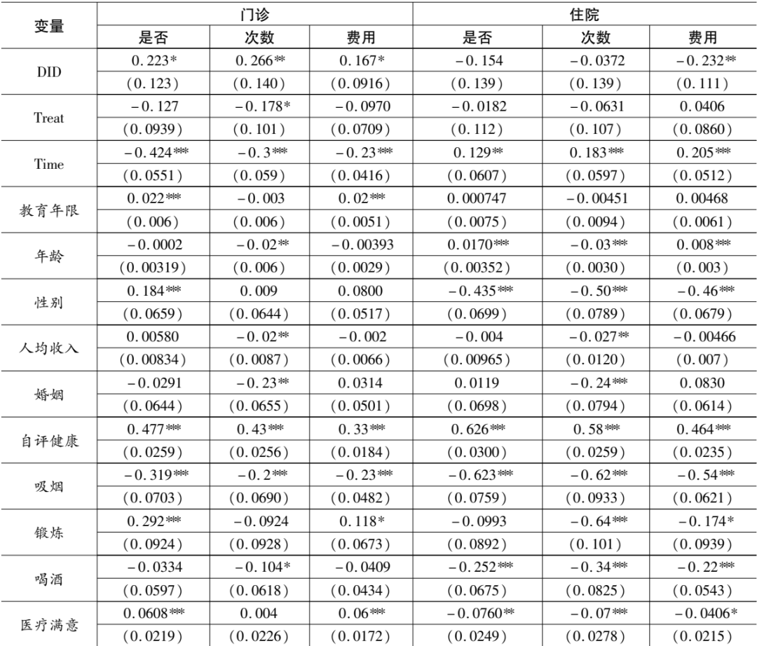 其中,下标i表示个体,t表示时期,Yit是因变量,即居民i在第t期的医疗服务利用指标。DIDit是核心解释变量。其中需要注意的是,是否门诊、是否住院是离散变量,门诊次数和住院次数是非负整数,如果采取OLS模型构建DID,则有可能导致结果的偏误。所以对于离散变量,本文使用Logit模型做DID的非线性估计。考虑到门诊次数和住院次数的方差大于平均数,且存在大量零值,所以使用零膨胀的负二次项回归模型做DID的非线性估计。