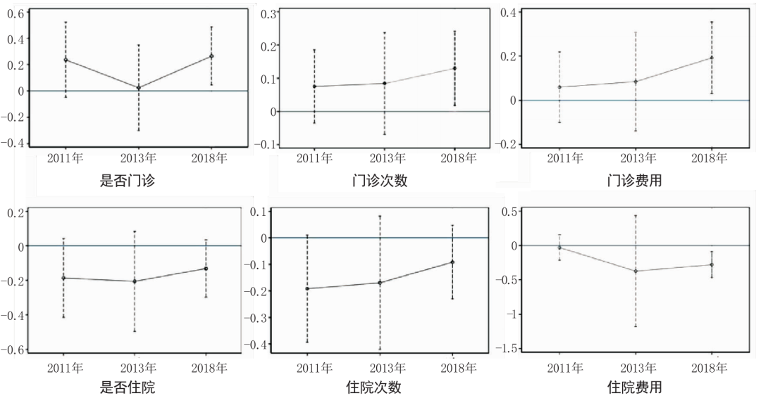 双重差分法能够正确识别因果效应的前提是假设实验组和对照组在政策冲击前具有平行趋势。研究者通常通过检验实验组和对照组事前趋势是否相同来间接地检验平行趋势假设。本文利用事件分析法来进行平行趋势的检验。以2015年为基期,考察政策发生前的2011年和2013年,以及政策发生后的2018年实验组和对照组被解释变量的差距与2015年实验组和对照组被解释变量的差距,是否存在明显变化,即是否显著异于0来间接地检验事前平行趋势是否成立。可以看到图3中,不同的医疗服务利用变量中,2011年和2013年实验组和对照组的差距与2015年实验组和对照组的差距之间没有明显变化,即都没有显著异于0,因此可以认为事前平行趋势得到了满足。