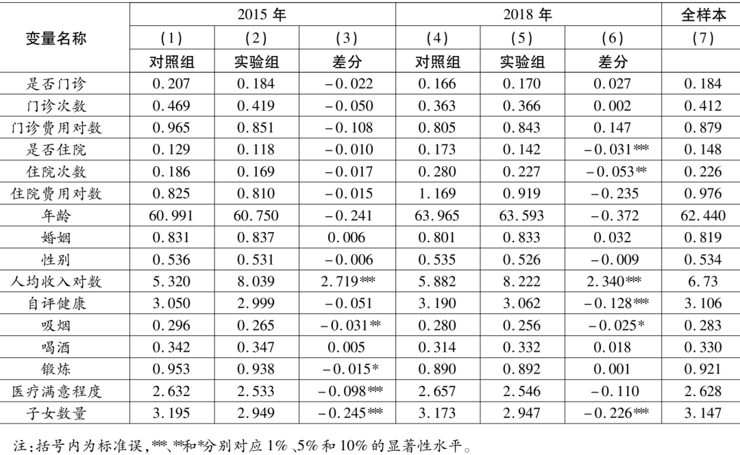 首先,在基期2015年和2018年,从过去一个月是否去看门诊以及过去一个月的门诊次数来看,全样本均值为0.184和0.412,这表明大部分中老年人在调研期一个月内还是较少看门诊。在基期2015年和2018年,实验组和对照组都不存在显著差异,但初步看来,医保整合后农村中老年人的门诊利用是提高的。从过去一年是否住院以及过去一年的住院次数来看,全样本均值为0.148和0.228,这表明大部分中老年人在调研期一年内还是较少住院。在2018年,实验组和对照组都存在显著差异,但初步看来,医保整合后农村中老年人的住院利用是降低的。在各个控制变量方面,大部分控制变量在实验组和对照组之间并不存在显著差异。虽然少部分变量比如医疗满意程度、子女数目等在实验组和对照组之间存在显著差异,但是这些差异在城乡居民医保整合政策实施前后没有发生明显变化。