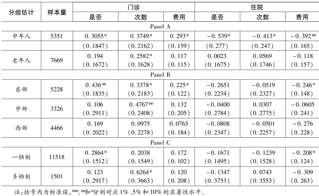对于Panel B,按照地区进行分组,具体分为西部地区、中部地区和东部地区。整体来看,城乡居民医保整合政策对东部地区的影响较为显著。其原因很可能与东部地区医疗水平较为发达,医疗保障能力更强,医保待遇提高更高有关。在医疗设备和技术方面,东部地区拥有大量的高端医疗设备和尖端技术,这些设备和技术在疾病诊治、手术治疗、康复治疗等方面具有很大的优势。在医务人员的素质和数量方面,东部地区的医务人员通常受过较高水平的医学教育和培训,具有更加专业的技能和丰富的经验,且医务人员的数量相对较多,能够更好地满足人民的医疗需求。在医疗服务利用的质量和数量方面,东部地区的医疗服务利用通常更加便捷和高效,能够提供更加全面、专业和优质的医疗服务利用。