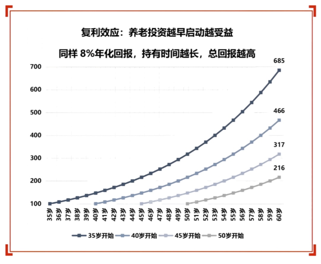 复利效应理论佐证养老规划越早越好:养老投资越早启动,复利效应越明显,投资时间越长,获得的总回报就越高。例如,年化回报8%的投资品,从35岁持续投资到60岁是45岁起投的2.2倍多。
