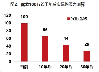 假设现在你30岁,储蓄100万元用于养老,到60岁退休,该笔钱实际仅为29万元