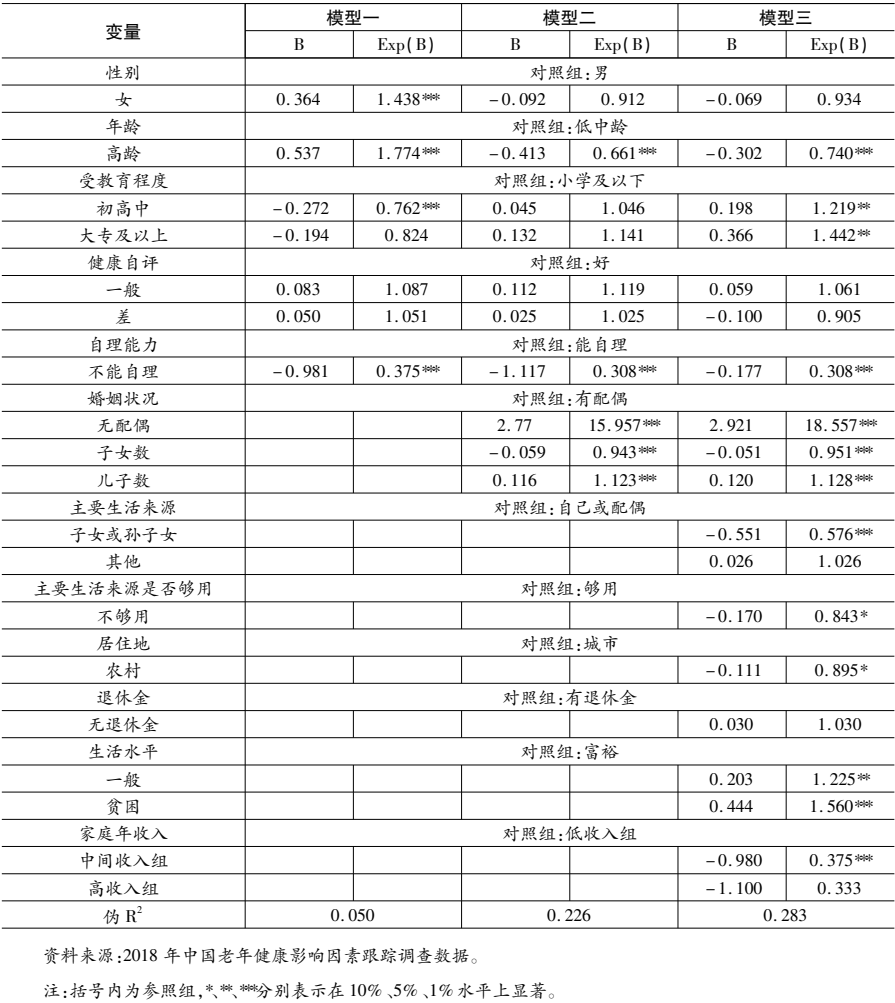 通过上文的交叉分析,可以看出,不同特征老年人的居住方式存在明显区别,但老年人的居住方式是多因素共同作用下的结果,因此需要引入回归分析,探索老年人居住方式的影响因素。由于1998年老年人部分变量数据存在缺失,并且老年人的居住方式在2008年和2018年的差异较小,因此本文选择对2018年老年人居住方式的影响因素进行分析。同时,对最新数据的分析也有助于把握老年人居住方式影响因素的现状。在具体方法的选择上,本文采用Logistic逐步回归分析方法。在模型一中,放入人口学特征变量,模型二在模型一的基础上加入家庭特征变量,模型三在此基础上加入社会经济特征变量。观察自变量的变化,并分析其成因。同时,本文自变量数量较多,为防止出现多重共线性,在回归分析前,需要对自变量进行共线性诊断。经检验,所有自变量的VIF值均在1—3之间,不存在多重共线性(见表4)。